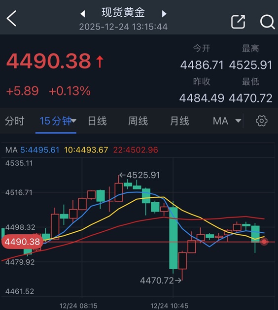 北京时间13:15,现货黄金报4490.38美元/盎司。